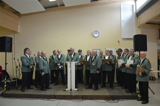 Als Hans-Peter Niesen König wurde, freute er sich wie ein Schneekönig und so sollte es sein, dass es am Sonntagmorgen auf dem Weg zum Kirchgang ordentlich schneite. Die Festmesse wurde feierlich mitgestaltet vom Kirchenchor Cäcilia. Bei der anschließenden Morgenfeier in der Schützenhalle bedankte sich unser 1. Vorsitzender Johannes Schiffgen beim Präses der Bruderschaft Rolf Schneider für die Gestaltung der Messe, bevor dann der Männergesangsverein unter der Leitung von Karl-Heinz Kremer einige Gesangsstücke zum Besten gab.